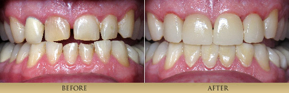 Through artistry and laboratory technique, we achieve outstanding and beautiful results restoring teeth with all- Porcelain Veneers and Porcelain Crowns. The cutting edge technology of adhesive bonding dentistry makes these restorations second to none. Many of the before and after cases you see here utilize this type of restoration-note their lifelike vitality. By removing unhealthy or cracked tooth structure and replacing it with natural looking porcelain, which fits the tooth like a thimble or jacket, we protect the remaining tooth structure and achieve a beautiful result.